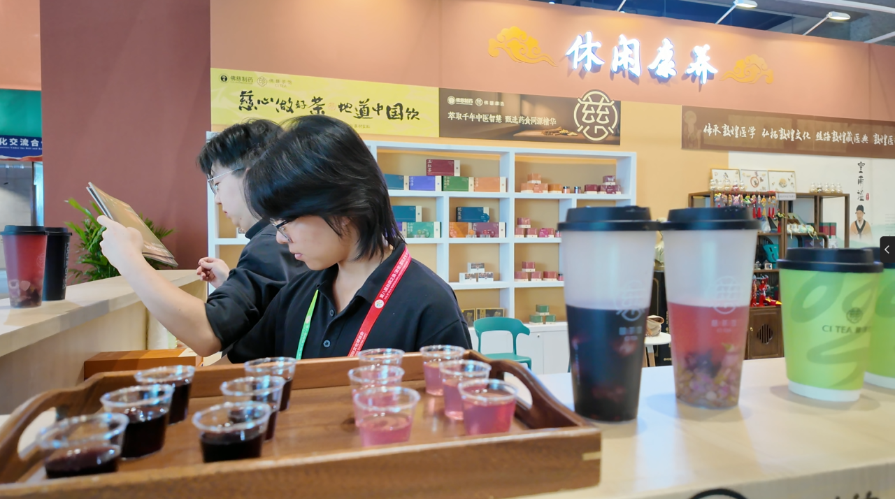 在甘肃文旅非遗文创展区,佛慈制药展位前的“佛慈茶馆”成为一道独特的风景线。这里没有苦涩的药味,取而代之的是氤氲茶香与阵阵惊叹。两款名为 “乌漆嘛黑” 与 “黄芪小心肝儿” 的创意茶饮,彻底刷新了人们对中药的传统认知。