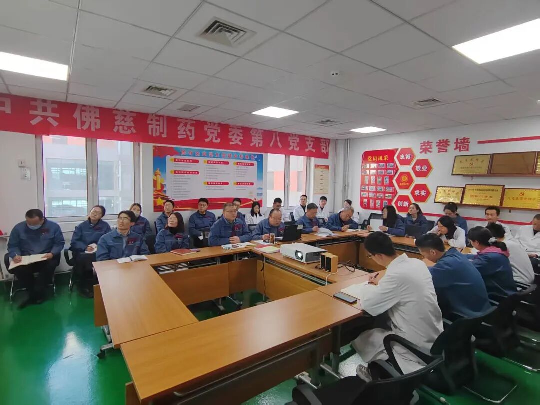 佛慈集团党委委员,佛慈制药党委副书记、总经理钱双喜在为第一、第十党支部宣讲时,紧密结合前处理车间和营销中心工作实际,要求全体党员立足岗位,保质保量完成生产任务,管理人员要勇于担当,同时要注重挖掘人才、传承中药炮制技艺。