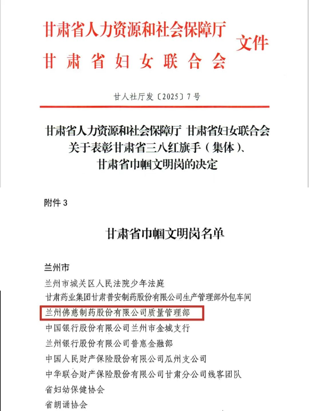 12月26日,甘肃省人力资源和社会保障厅、甘肃省妇女联合会联合发布表彰决定,授予兰州佛慈制药股份有限公司质量管理部“甘肃省巾帼文明岗”荣誉称号。这既是对该部门全体成员——尤其是占比61%的女性职工团队长期恪尽职守、精益求精、勇于担当、甘于奉献的崇高赞誉,也是对佛慈制药秉持质量至上、追求卓越企业精神的有力肯定。