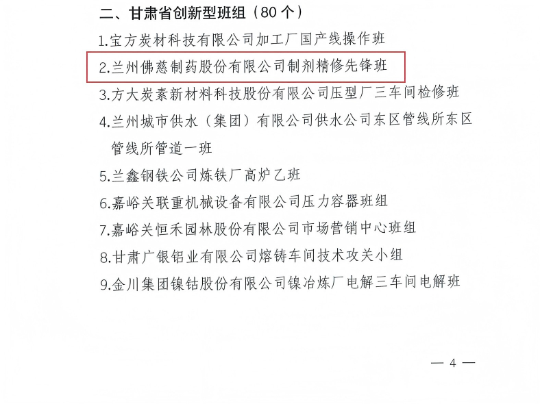 近日,甘肃省总工会发布通知,兰州佛慈制药股份有限公司制剂精修先锋班入选“2025年甘肃省总工会支持建设甘肃省创新型班组”名单。制剂精修先锋班凭借技术攻坚、工艺优化、质量提升等方面的优异成绩成功入选,充分体现了佛慈制药在落实省总工会基层创新领域的标杆引领作用与强劲实力。
