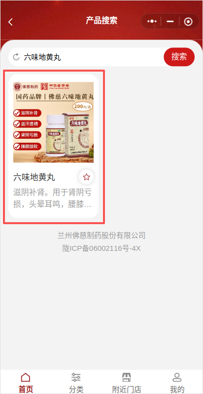 第一步:在搜索框输入产品名称“六味地黄丸”,点击搜索。