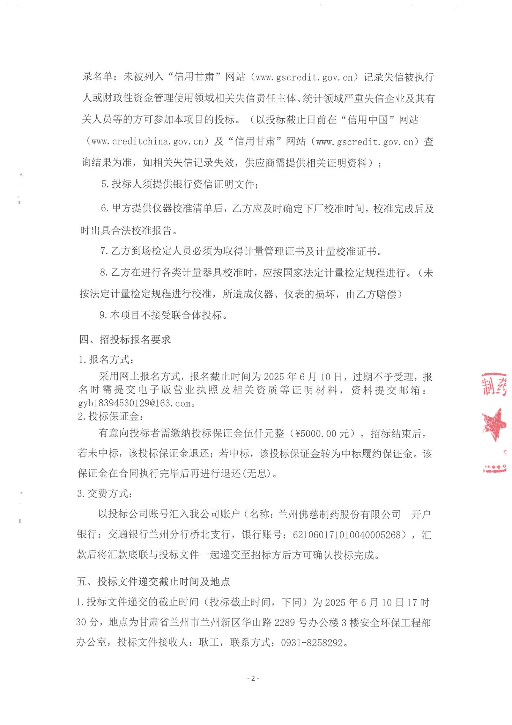 兰州佛慈制药股份有限公司计量器具检定服务招标公告