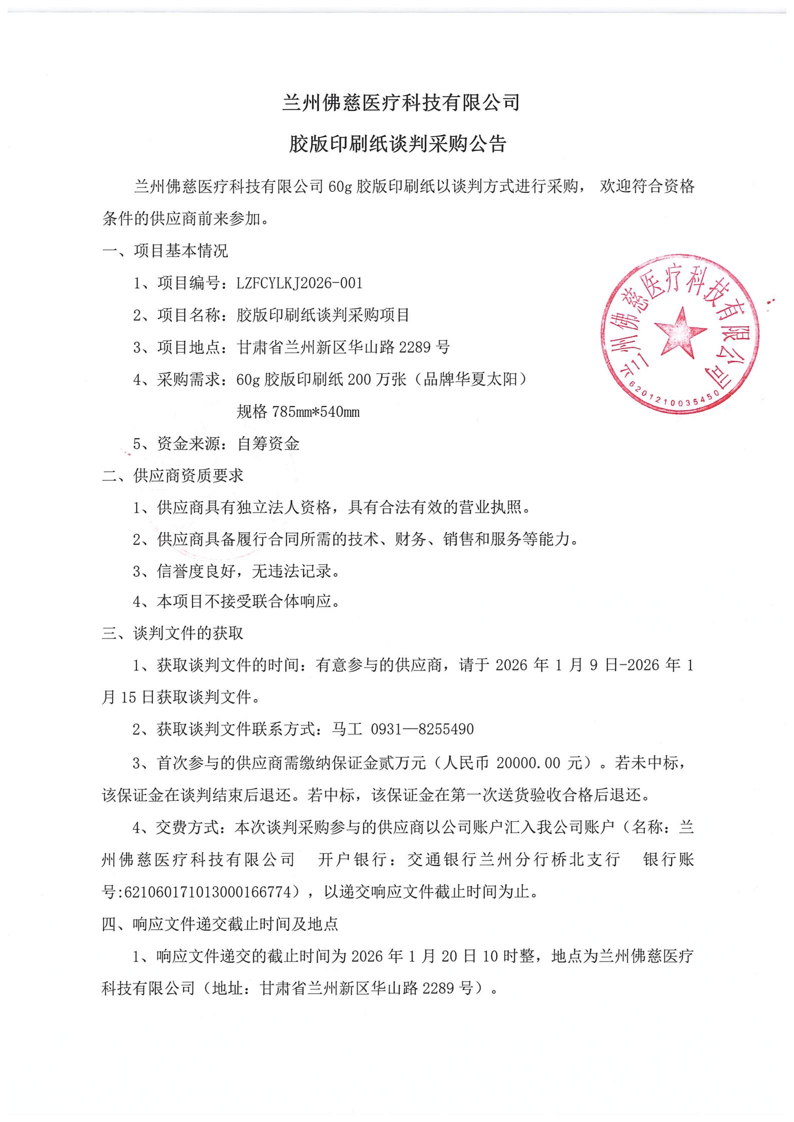 兰州佛慈制药股份有限公司胶版印刷纸谈判采购公告