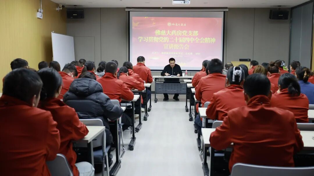 佛慈集团党委副书记、总经理,佛慈制药党委委员胡凯在提取车间第二党支部和佛慈大药房党支部宣讲时,围绕党的二十届四中全会的重大意义、核心要义和实践要求,结合佛慈集团发展战略与中药制造行业特点,将学习成果转化为推动中药提取工艺革新、保障产品质量安全、冲刺年末生产目标的实际行动。