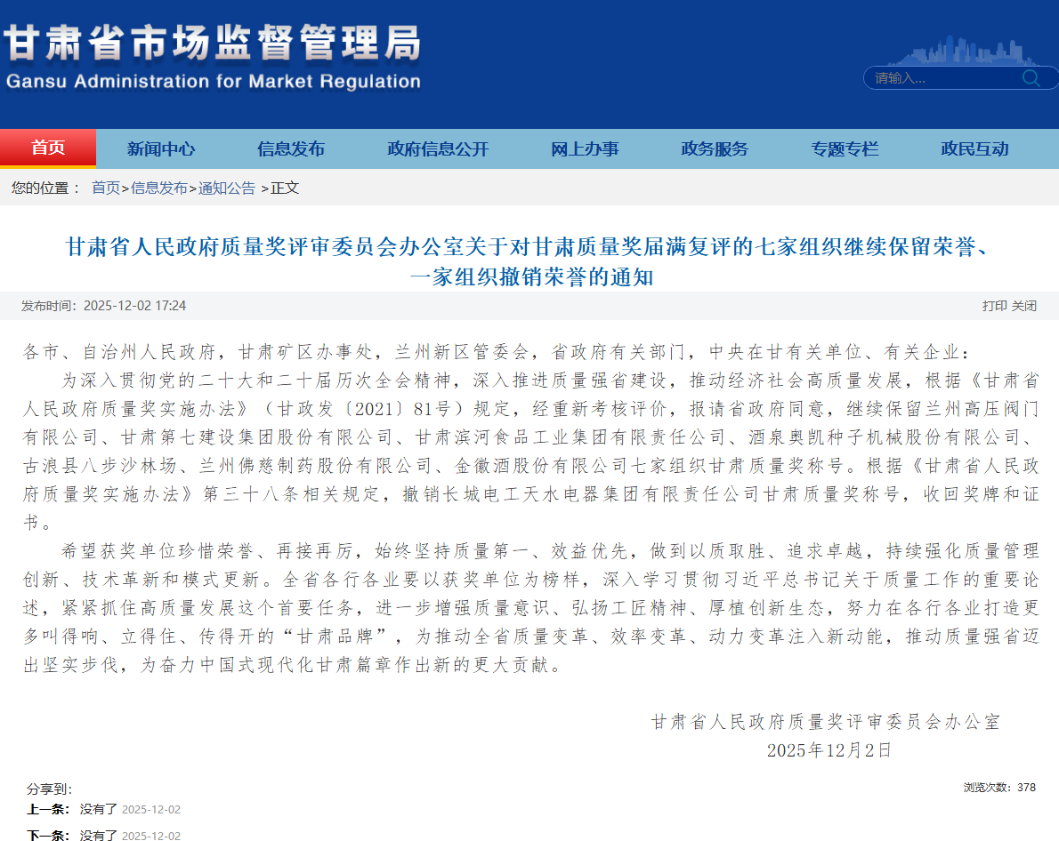 2025年12月2日,甘肃省市场监督管理局发布了《关于对甘肃质量奖届满复评的七家组织继续保留荣誉、一家组织撤销荣誉的通知》,佛慈制药凭借持续卓越的质量管理水平和突出的综合竞争优势,蝉联“甘肃质量奖”。