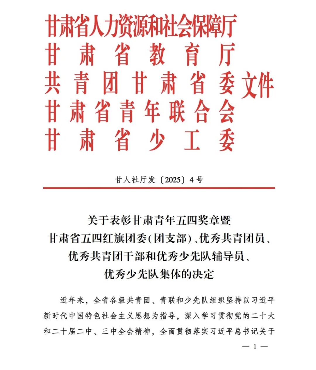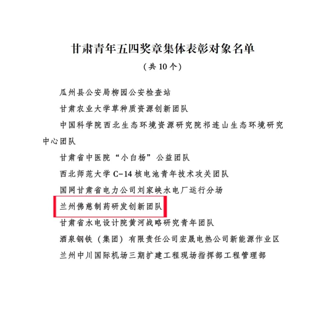 近日,共青团甘肃省委、甘肃省人力资源和社会保障厅五部门联合公布了2025年度“甘肃青年五四奖章”评选结果。兰州佛慈制药股份有限公司研发创新团队凭借在中医药传承与创新领域的所做出的贡献,被授予“甘肃青年五四奖章集体”荣誉称号。此项荣誉既是对团队青年科研实力的高度认可,也彰显了佛慈制药以科技创新推动高质量发展的企业担当。