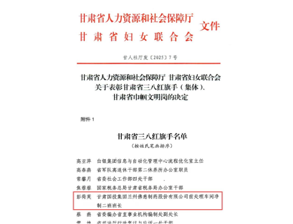 12月26日,甘肃省人力资源和社会保障厅、甘肃省妇女联合会联合发布《关于表彰甘肃省三八红旗手(集体)、甘肃省巾帼文明岗的决定》(甘人社厅发〔2025〕7号),兰州佛慈制药股份有限公司前处理车间净制二班班长彭荷英同志荣获“甘肃省三八红旗手”称号。这是对我公司一线职工敬业奉献、奋发有为精神的高度认可,也是佛慈制药百年匠心传承与新时代巾帼力量的生动写照。
